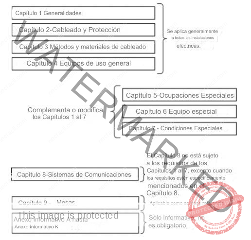 Los Capítulos 1 , 2 , 3 y 4 se aplican en general. Los Capítulos 5 , 6 y 7 se aplican a ocupaciones especiales, equipos especiales u otras condiciones especiales y pueden complementar o modificar los requisitos de los Capítulos 1 al 7.
